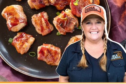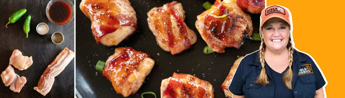 Looking for an easy crowd-pleasing appetizer? Look no further. These bacon-wrapped chicken thighs from pitmaster Christie Vanover of Girls Can Grill are super simple to make and have just the right amount of heat with a jalapeno slice inside and a sweet sticky coating of raspberry chipotle sauce.