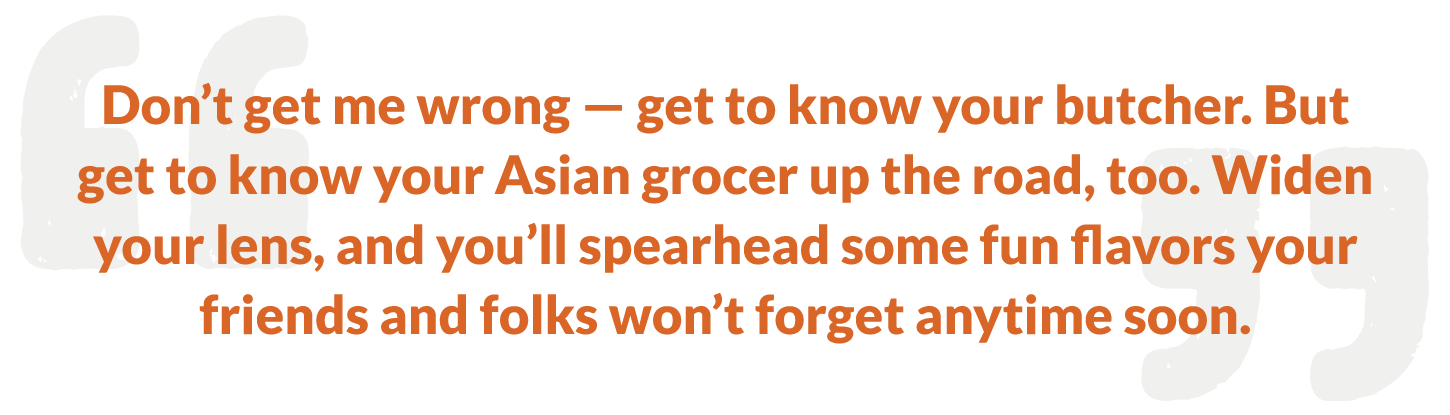 The world’s bigger than briskets and burgers. Don’t get me wrong — get to know your butcher. But get to know your Asian grocer up the road, too. Widen your lens, and you’ll spearhead some fun flavors your friends and folks won’t forget anytime soon.